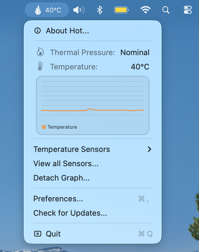 An dieser Stelle möchte ich auf die kleine Software Hot hinweisen, welche in der Statusbar des Macs über die aktuelle Temperatur berichtet und über Graphen auch den Verlauf sowie andere Temperatur-Sensoren aufzeigt.